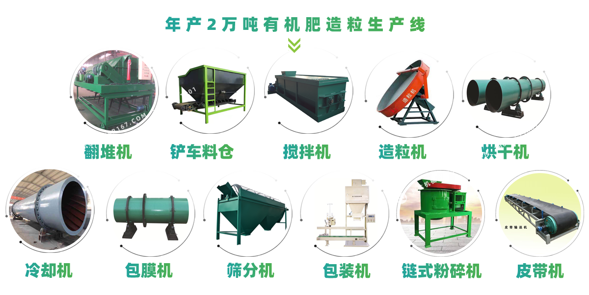 在本生產(chǎn)線里我配備的粉碎機(jī)是半濕物料粉碎機(jī)主要用于水分在25—30%的雞糞,牛糞,豬糞,羊糞,以及其他物有機(jī)物料的粉碎效果極佳,設(shè)備配置里邊造粒機(jī)我?guī)湍渲昧诵滦陀袡C(jī)肥造粒機(jī),主要適用于畜禽糞便、酒糟、藥渣、沼渣、木粉等含有纖維素的有機(jī)物料,可以直接造粒,成球率高,顆粒強(qiáng)度好,節(jié)省烘干成本,生產(chǎn)過(guò)程中主機(jī)不需要專人操作。將發(fā)酵后的物料進(jìn)入粉碎機(jī)打成粉狀后;將物料輸送至攪拌機(jī)均勻攪拌;攪拌均勻后通過(guò)輸送機(jī)進(jìn)入造粒機(jī)造粒,造出來(lái)的顆粒因?yàn)樗直容^大需要進(jìn)入烘干機(jī)去除水分;顆粒從烘干機(jī)出來(lái)以后溫度高,由于烘干產(chǎn)生的冷凝水附著在顆粒表層,不易包裝,容易結(jié)塊,所以要經(jīng)過(guò)冷卻機(jī)利用加快空氣回流的原理使顆粒表層溫度降低,將冷凝水變成蒸汽揮發(fā),這一道工藝可以大大促進(jìn)肥料的保存效果,增長(zhǎng)保存周期;冷卻之后的顆粒還存在大小不一的情況,要經(jīng)過(guò)篩選機(jī),把不符合標(biāo)準(zhǔn)的要經(jīng)過(guò)篩選機(jī)廢料出口粉碎之后重新進(jìn)入造粒機(jī)再次造粒,符合標(biāo)準(zhǔn)的顆粒就可以直接打包銷售了。